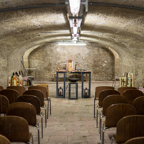 Die ehemalige Unterkirche der Pfarre Nonntal wurde saniert, und steht jetzt als festlicher Raum für Feiern zur Verfügung. Das historische Steingemäuer verleiht der Krypta eine besinnliche Atmosphäre und bildet eine schöne Kulisse für alle möglichen Veranstaltungen.