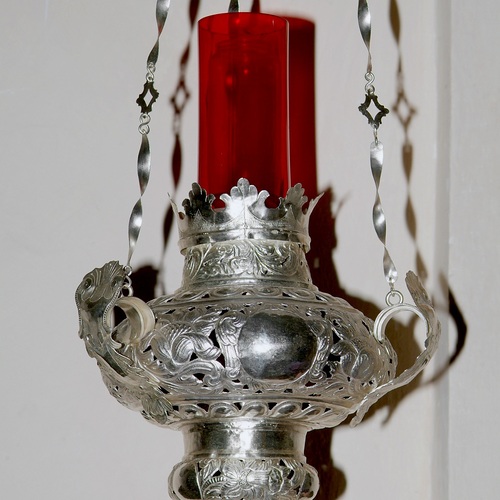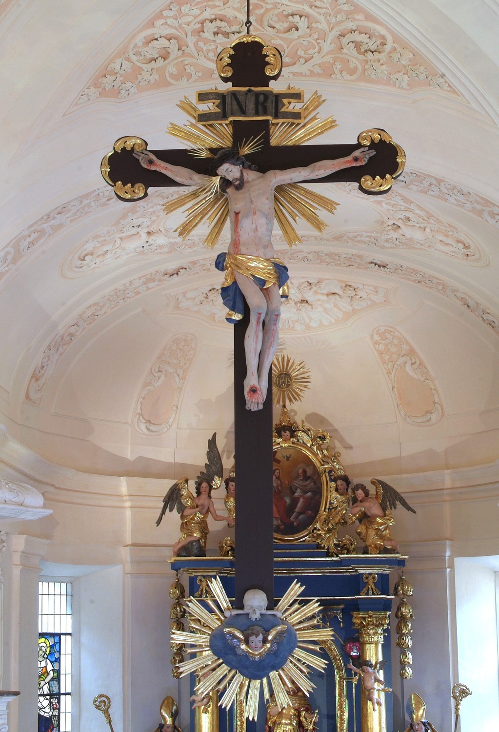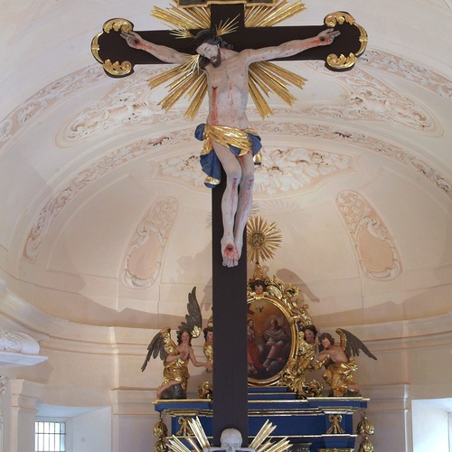 Das Hochkreuz stammt ebenfalls aus dem 18. Jahrhundert, ein lebensgroßer Christus, zu Füßen einen Totenschädel als Sinnbild dafür, dass unser Erlöser den Tod überwunden hat.